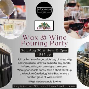 Join Wick and Pour Studio and Castlerigg Wine Shop for an unforgettable day of creativity and indulgence! Begin your candle making experience in their cozy studio where you will choose from a variety of premium seasonal scents to craft a beautiful soy candle. While your candle cures, take a short stroll up the block to the visit us at Castlerigg Wine Bar, where a curated glass of wine awaits! Package price include candle and a glass of wine. *Must be 21 yrs or older to attend. Registration required. Must Book Your Seat through Wick and Pour Studio at: www.wickandpourstudio.com/candle-pouring-1